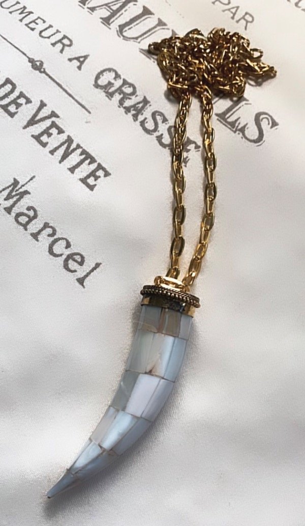 Dije de India con nácar y engarce original dorado. Podes elegir con cadena o tiento de gamuza